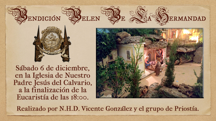 † El próximo sábado, 6 de diciembre, en la Iglesia de Nuestro Padre Jesús del Calvario, tras la finalización de la Eucaristía de las 18:00 horas, se procederá a la bendición del Belén de la Hermandad, realizado por N.H.D. Vicente González Toscano y el grupo de priostía de la Hermandad.