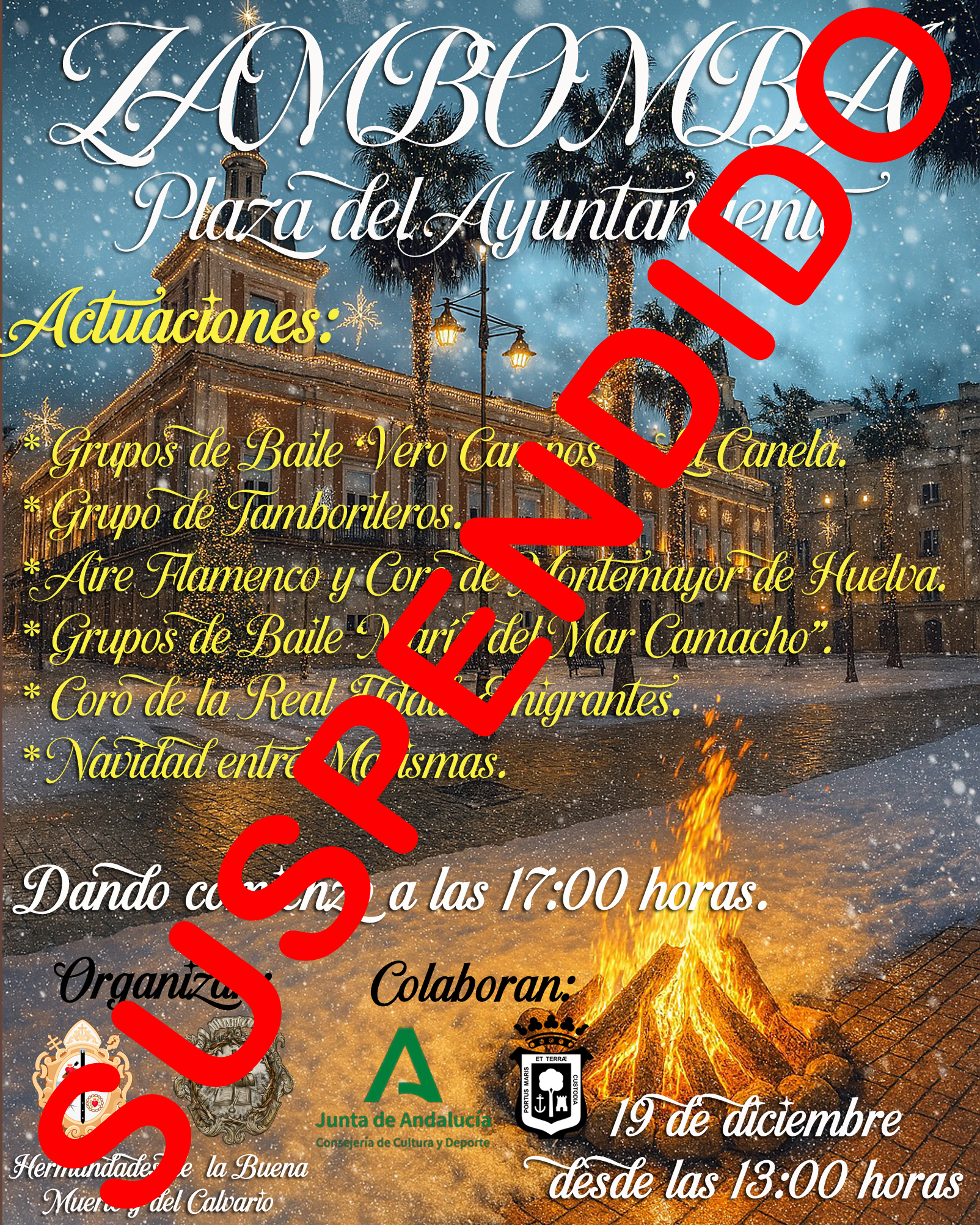 † Lamentamos informar que, debido a los pronósticos meteorológicos adversos y para garantizar la seguridad de los asistentes y la calidad de las actuaciones, nos vemos obligados a cancelar la celebración de la 🔥 Zambombá 🎄 prevista para mañana, viernes 19 de diciembre, que organizábamos conjuntamente con la Hermandad de la Buena Muerte.
