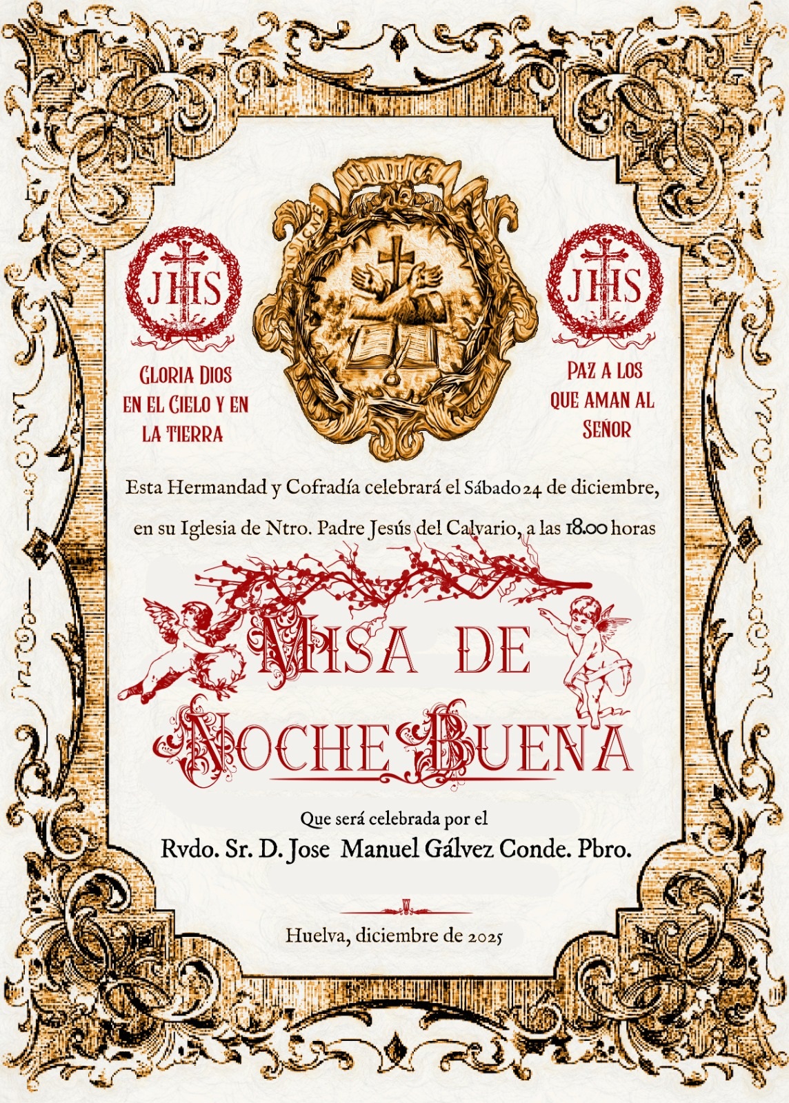 † El próximo martes 24 de Diciembre a las 18:00 horas, celebramos en la Iglesia de Nuestro Padre Jesús del Calvario, la Misa de Noche Buena, presidida por el Rvdo. Sr. D. José Manuel Gálvez Conde. Es una forma hermosa de celebrar el nacimiento del Niño Dios.