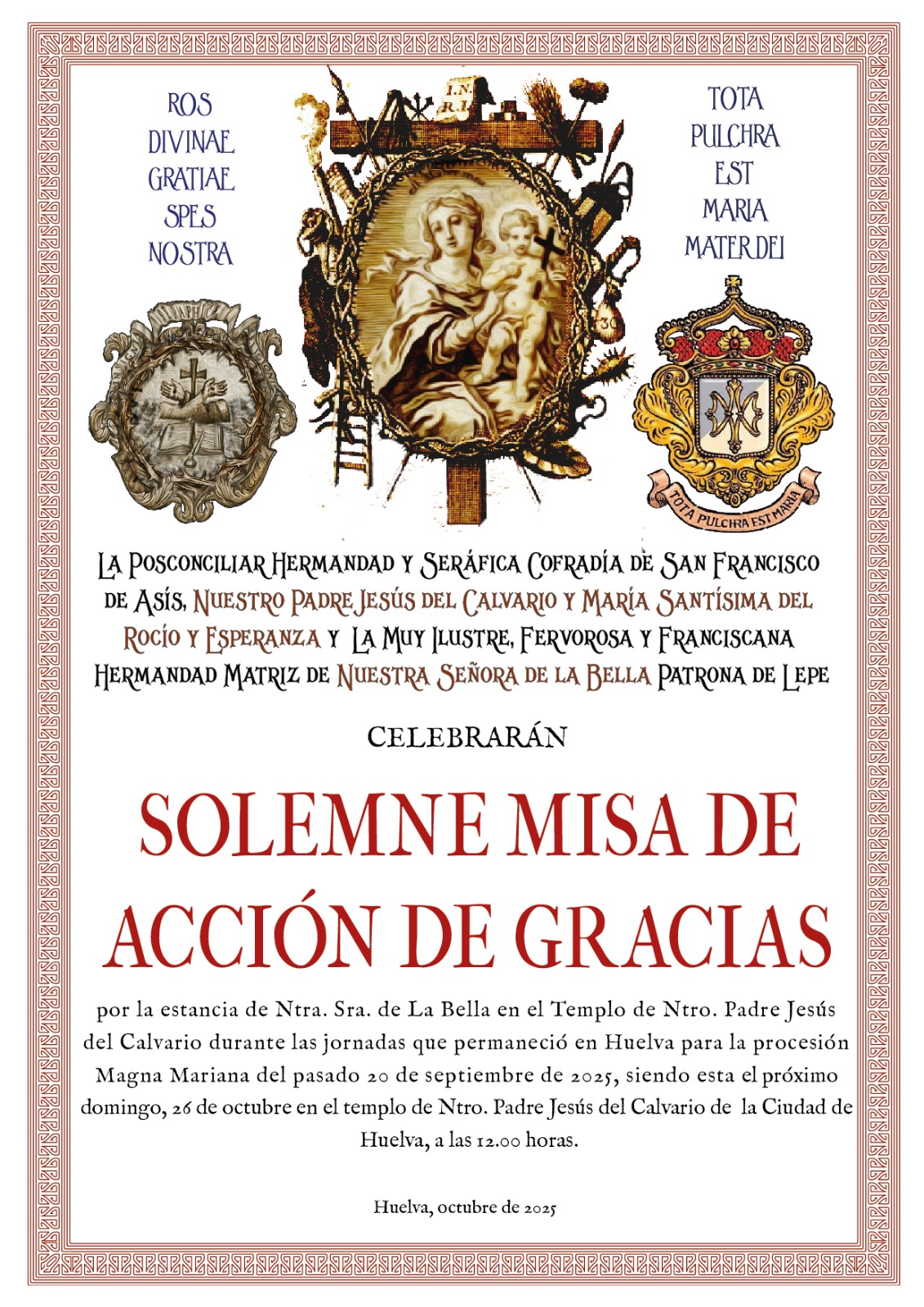 † SOLEMNE MISA DE ACCIÓN DE GRACIAS por la estancia de Ntra. Sra. de la Bella en el Templo de Nuestro Padre Jesús del Calvario durante las jornadas que permaneció en Huelva para la procesión Magna Mariana del pasado 20 de septiembre, siendo esta el próximo domingo, 26 de octubre a las 12:00 horas en la Iglesia de Nuestro Padre Jesús del Calvario, siendo oficiada por Ilmo. y Rvdmo. Sr. D. Carlos Javier Rodríguez Parra, Director Espiritual de nuestra Hermandad y Párroco de la Purísima Concepción.