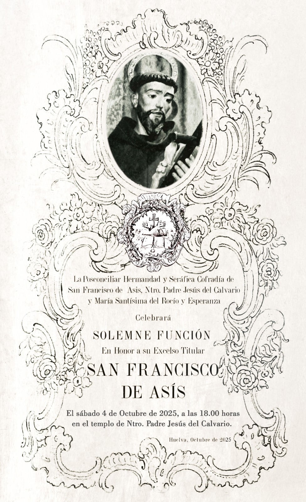 † SAN FRANCISCO DE ASÍS. Como prescriben nuestras Reglas, el próximo sábado 4 de Octubre, a las 18:00 horas, celebraremos en nuestra Iglesia Misa en Honor de San Francisco de Asís, que será predica el Reverendo Padre Fray José Luis Millán Romero, OFM, Párroco del Monasterio de Santa María de la Rábida.